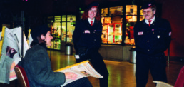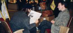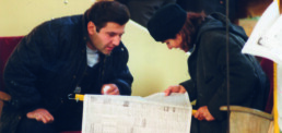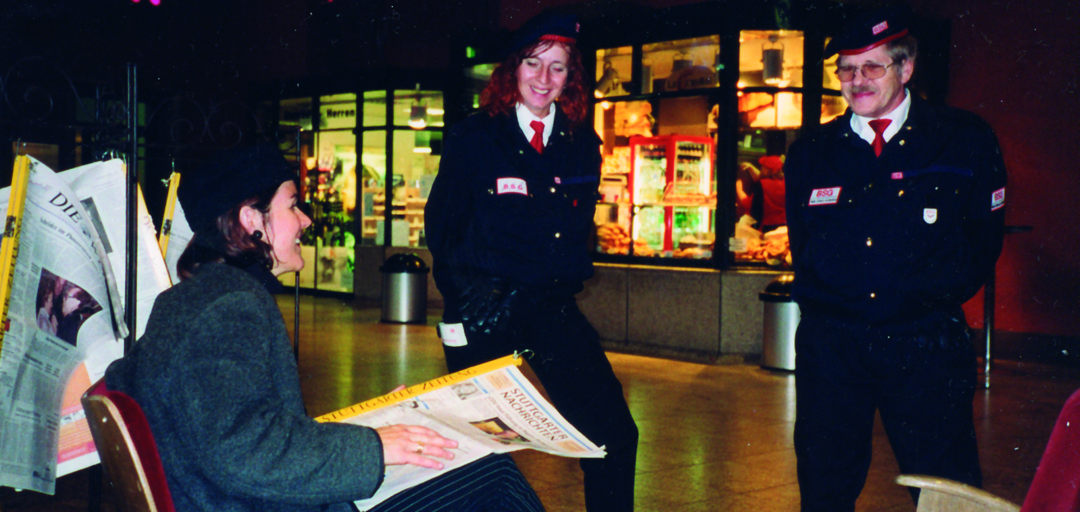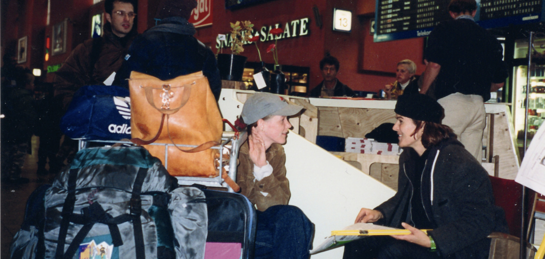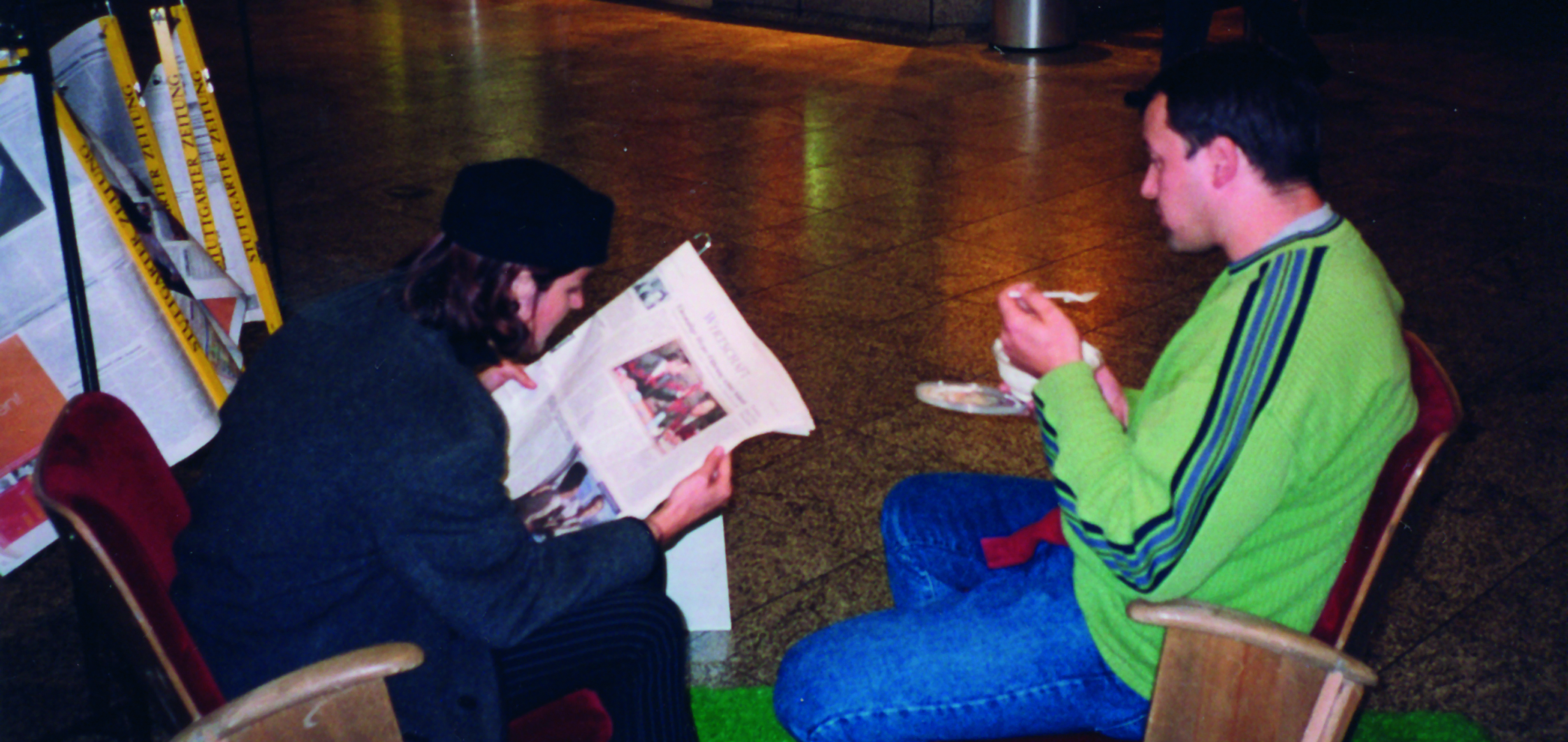 Im Empfangsgebäude, inmitten anderer Service-Einrichtungen installiere ich meinen Stand, an dem ich Vorübergehenden anbiete, ihnen etwas aus der Zeitung vorzulesen.