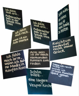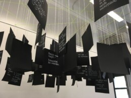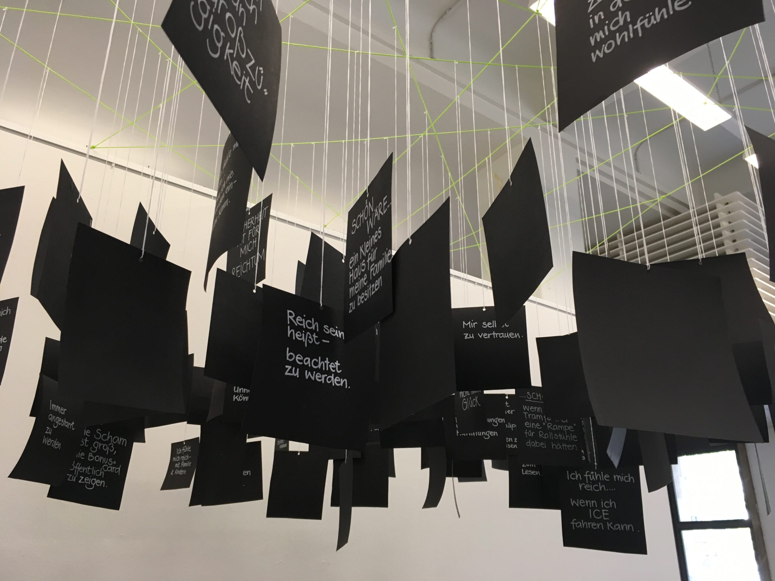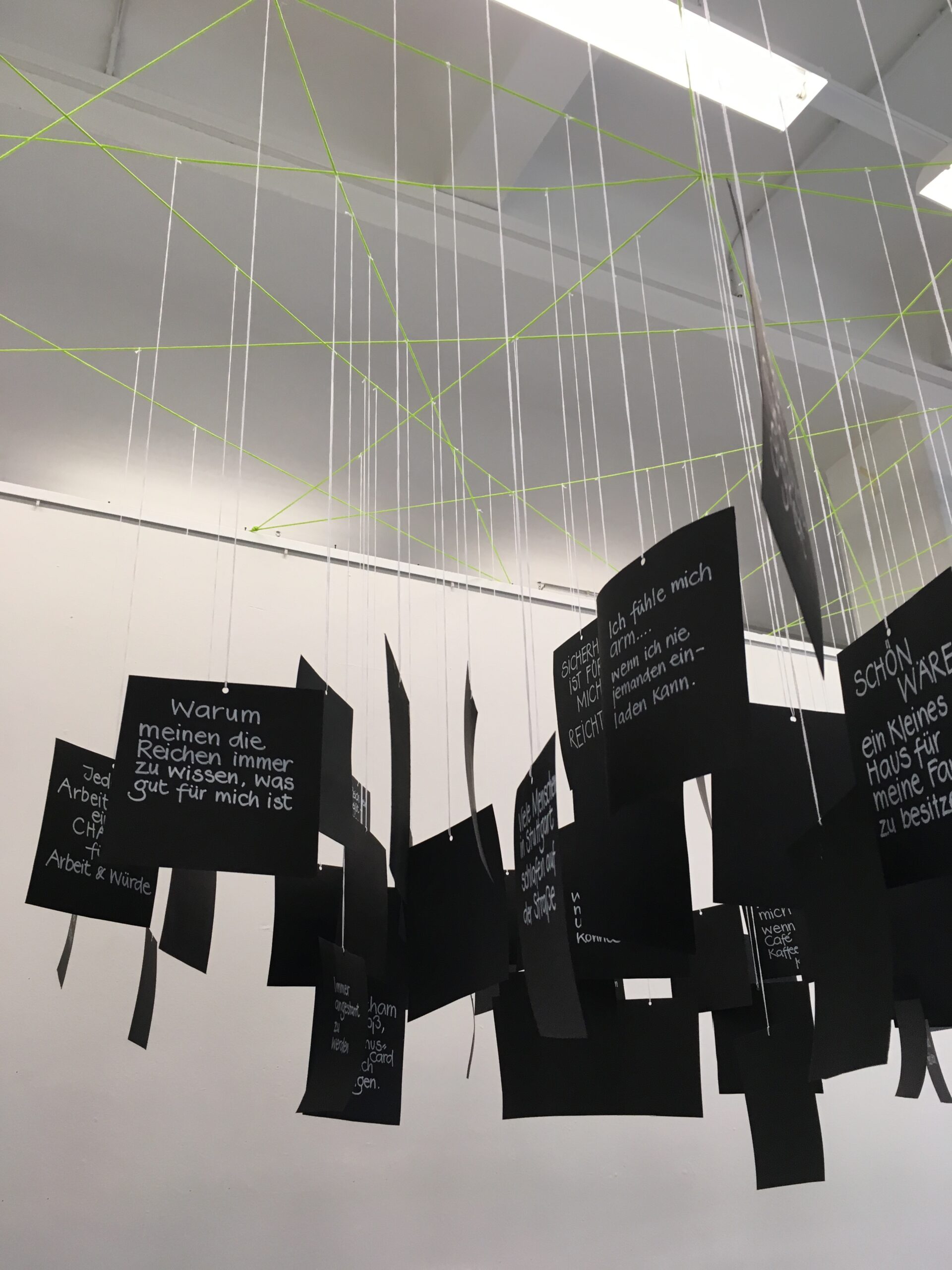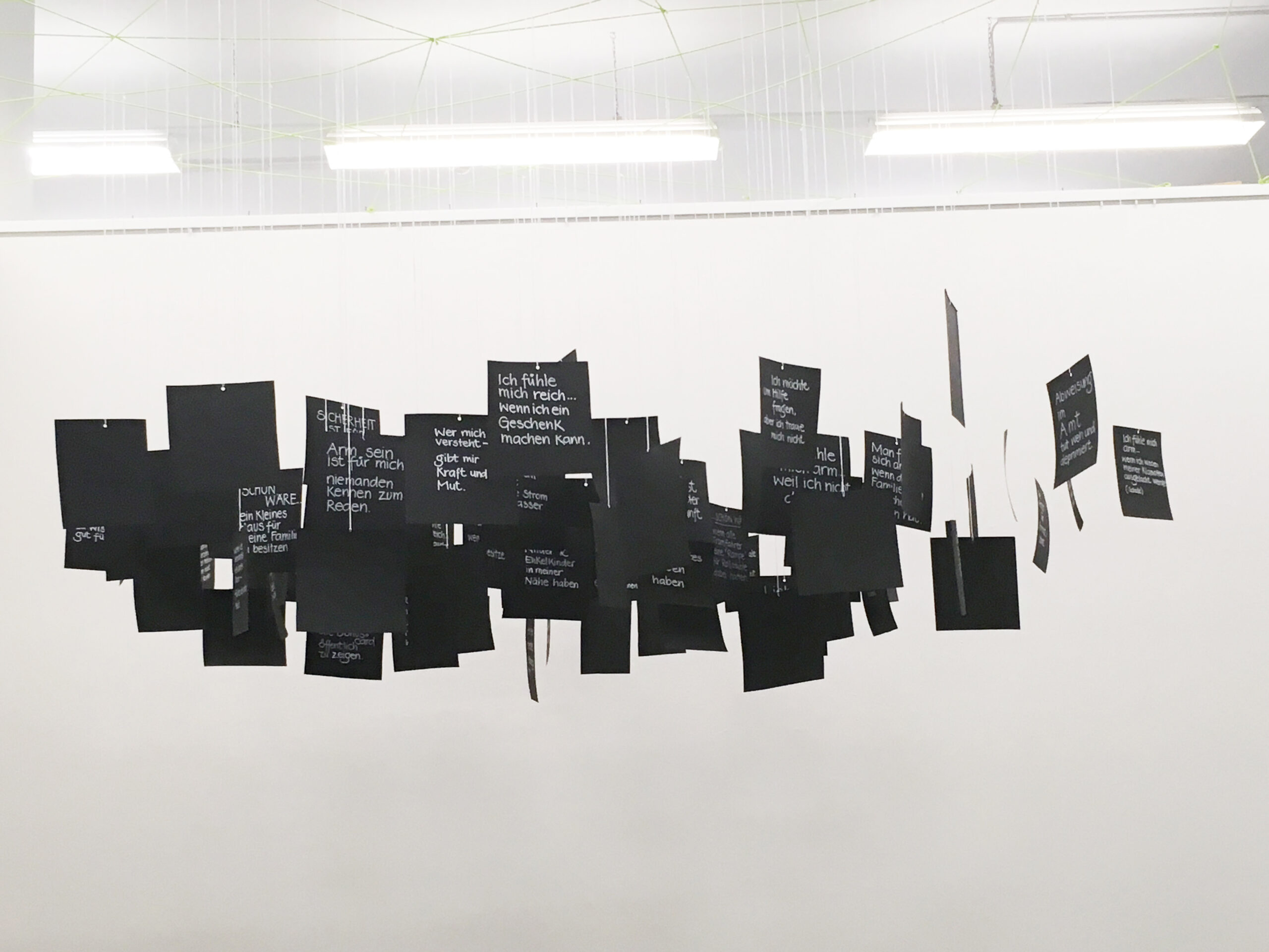 Zu sehen sind dreiundneunzig Kommentare von Menschen verschiedenen Alters, die in unserer Stadt am Existenzminimum leben. Angeknüpft an ein Geflecht von netzartig gespannten Schnüren hängen sie als Cloud frei und deutlich lesbar über den Köpfen der Besucher*innen. Die persönlichen Äußerungen als Grenzen überbrückendes und Empathie stiftendes Medium – als Bindeglied und Schnittstelle zwischen Alltagsrealität unserer Gesellschaft und Kunst.